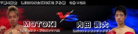 ![]() LEGION☆KICK ミドル級 3分×3R 〈1R2分28秒 3ダウンによるTKO〉 ●MOTOKI(レジェンド・ドラゴンGYM) VS 〇内田 貴大(MSJキックボクシングジム) |