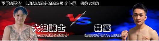 ![]() LEGION☆MMA ライト級 5分×3R 〈1R31秒 チョークスリーパーによる一本勝ち〉 ●大迫 誠士(volcano柔術&MMA) VS 〇森 優(BLOWS OITA LIFE) |