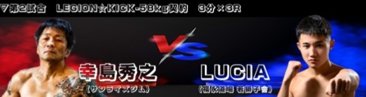 ![]() LEGION☆KICK −58kg契約 3分×3R 〈3R2分16秒 TKO〉 ●幸島 秀之(サンライズジム) vs 〇LUCIA(福永道場 若獅子會) |