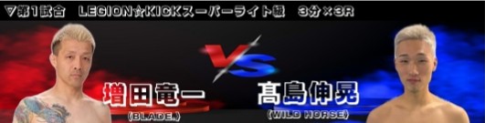 ![]() LEGION☆KICK スーパーライト級 3分×3R 中止 増田竜一(BLADE.) vs 髙島 伸晃(WILD HORSE) |