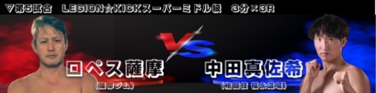 | 第5試合 | ![]() LEGION☆KICK スーパーミドル級 3分×3R 〈2R1分3秒 肘カットによるTKO〉 ●ロペス薩摩(薩摩ジム) VS 〇中田 真佐希(格闘技 福永道場) |