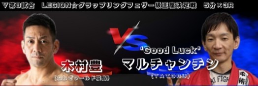 | セミファイナル | ![]() LEGION☆グラップリング フェザー級 王座決定戦 5分×3R 〈判定 1−2〉 ●木村 豊(ねわざワールド桜島) VS 〇Good Luck'マルチャンチン(TATORU) |