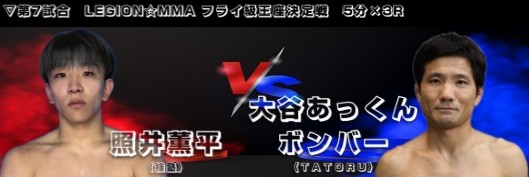 | 第7試合 | ![]() LEGION☆MMA フライ級 王座決定戦 5分×3R 〈3R3分16秒 パウンドによるTKO〉 〇照井 薫平(桂塾) VS ●大谷あっくんボンバー(TATORU) |