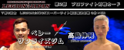 | 第6試合 | ![]() LEGION☆KICK スーパーライト級 王座決定戦 3分×5R 〈判定 3−0〉 〇ペレーサンライズジム(サンライズジム) VS ●髙島 伸晃(WILD HORSE) |