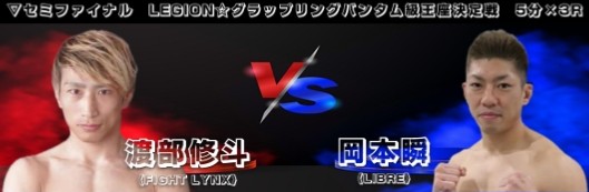 | 第8試合 | ![]() LEGION☆グラップリング バンタム級 王座決定戦 5分×3R 〈1R51秒 フロントチョークによる一本勝ち〉 〇渡部 修斗(FIGHT LYNX) VS ●岡本 瞬(LIBRE) |