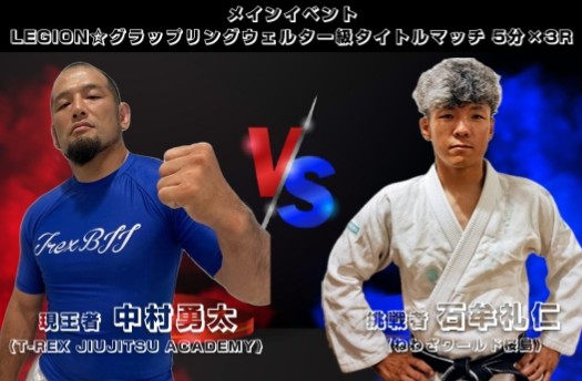 ![]() LEGION☆グラップリング ウェルター級 タイトルマッチ 5分×3R 〈2R2分12秒 アームロックによる一本勝ち〉 現王者 〇中村 勇太(T-REX JIUJITSU ACADEMY) VS 挑戦者 ●石牟礼 仁(ねわざワールド桜島) |